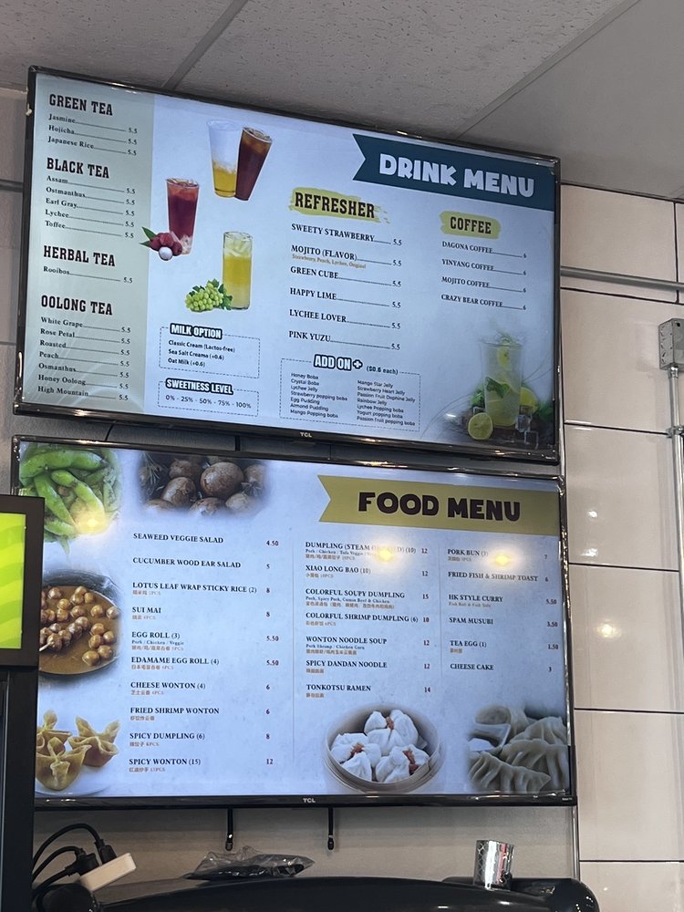 “ We stopped by today with a groupon and had 3 boba drinks that were awesome. We hadn't been in before so the woman working the counter took time to walk us through some of the options. I wish they had had pictures of each drink with ingredients at the store (she did say their "kiosk" was broken so perhaps when that is working it does have more detail but she kindly walked us through everything. We ordered a Cloud Coffee (Espresso, sweetened milk and I added Almond Pudding). This was my favorite. You can also determine what "sweetness level" you want. I got the sweetest and it was GREAT! We ordered a Thai Tea and this came with Boba and I put Egg Custard in it. It was good but even though I ordered the sweetest level, it still could have used a little more. I also got it with Half and Half. The last drink was a Crazy Bear Coffee with Almond Pudding. The Almond pudding gave a nice addition to the texture and flavor. This drink came with Handmade Brown Sugar, Espresso, and milk. When I get this one again I will order with half and half for a creamier drink but it was awesome as is. We did order steamed chicken dumplings to take home and they were ok. If we order those again I will go with Pork and Fried. The chicken was ok but nothing exciting. 5/5 for the drinks and a 3/5 for the Dumplings. See you next time! ”